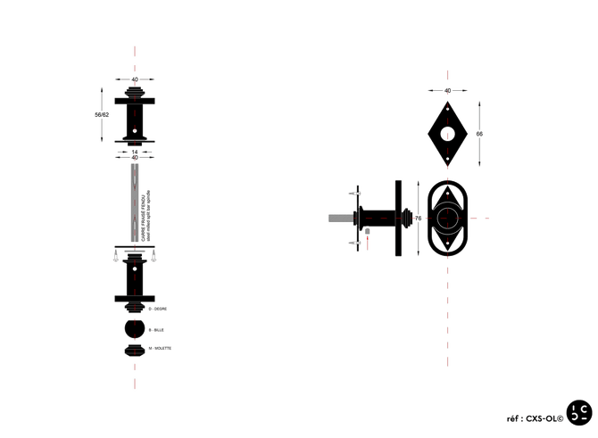 Insert the nylon washer between the handle and the decorative plate. With the Allen key, screw the grub screw located under the handle on the split square on the countersunk side. The screw will spread the square and allow a perfect hold. When tightening, the handles must be on one side as on the other well pressed against the plate. Installation by a diligent professional is recommended.