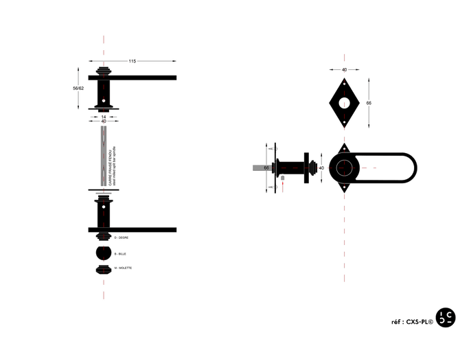 Insert the nylon washer between the handle and the decorative plate. With the Allen key, screw the grub screw located under the handle on the split square on the countersunk side. The screw will spread the square and allow a perfect fit. When tightening, the handles must be on one side as on the other well pressed against the plate. Installation by a diligent professional is recommended.