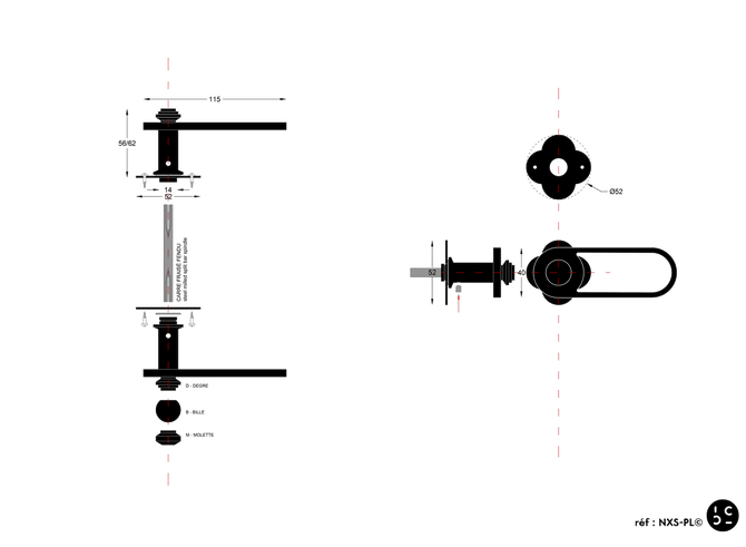 We recommend fitting the handles “blank” then marking the holes necessary for fixing the plate. Disassemble the assembly then drill the pre-holes for the screws with a suitable drill bit.