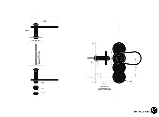We recommend fitting the handles “blank” then marking the holes necessary for fixing the plate. Disassemble the assembly then drill the pre-holes for the screws with a suitable drill bit.