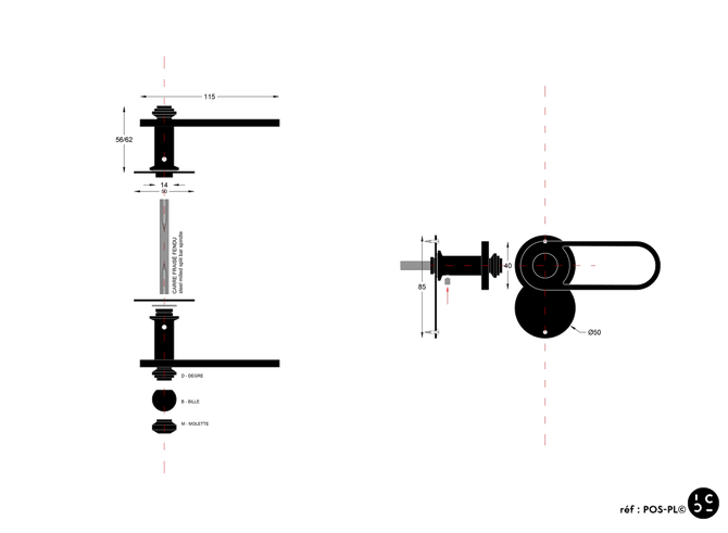 Using the Allen key, screw the pointed screw located under the handle onto the slotted square on the countersunk groove side... The screw will spread the square and ensure a perfect fit.