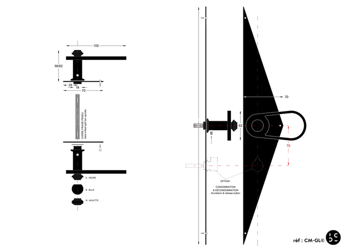 By choosing this option you will have to make sure to equip your door with a French lock whose handle → locking center distance measures 70mm. (See map opposite)