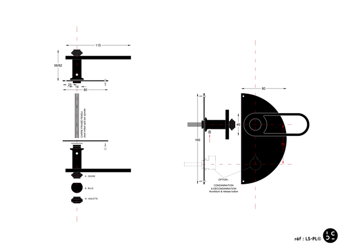 Insert the nylon washer between the handle and the decorative plate. With the Allen key, screw the grub screw located under the handle on the split square on the countersunk side. The screw will spread the square and allow a perfect fit. When tightening, the handles must be on one side as on the other well pressed against the plate. Installation by a diligent professional is recommended.