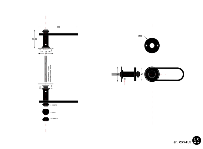 We recommend fitting the handles “blank” then marking the holes necessary for fixing the plate. Disassemble the assembly then drill the pre-holes for the screws with a suitable drill bit.
