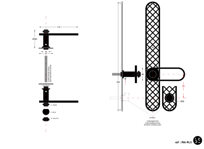 By choosing this option you will have to make sure to equip your door with a French lock whose handle → locking center distance measures 70mm. (See map opposite)